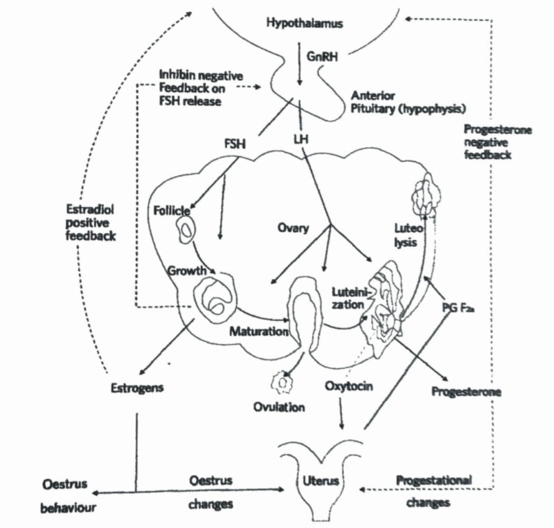 Oestrous cycle is regulated by the hypothalamic-pituitary-gonadal axis, which produces hormones. The reproductive axis is composed of the hypothalamus, pituitary, and the ovary. The hypothalamus is a specialized portion of the ventral brain, its primary function is to release gonadotropin hormones (GnRH).
